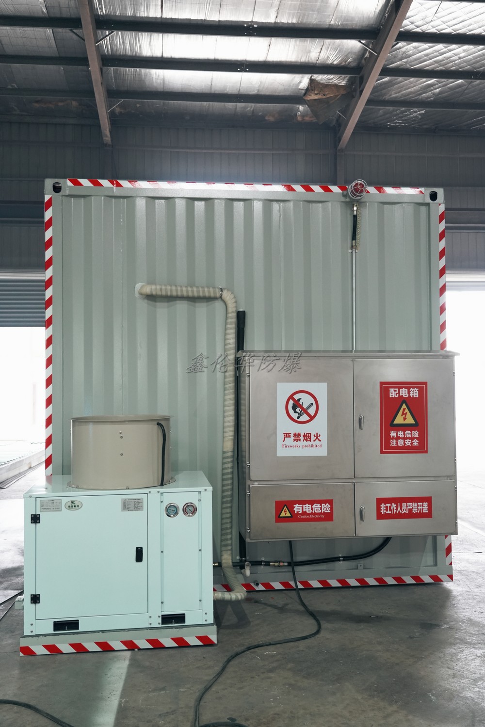 • 防爆設(shè)備:包括防爆空調(diào)、照明燈、監(jiān)控系統(tǒng)、自動滅火裝置、煙霧報警器等,所有電路采用防爆穿線管、接線盒及開關(guān),防止電氣火花引發(fā)爆炸。