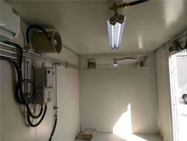 防爆集裝箱設(shè)有防爆配電箱1臺(tái),內(nèi)部元器件采用正泰品牌,.滿足內(nèi)部照明、風(fēng)機(jī)、報(bào)警等元器件供電,內(nèi)部配有LED防爆防腐全塑熒光燈2只,防爆照明開關(guān)2只,獨(dú)立控制照明,防爆應(yīng)急標(biāo)志一體燈1只。